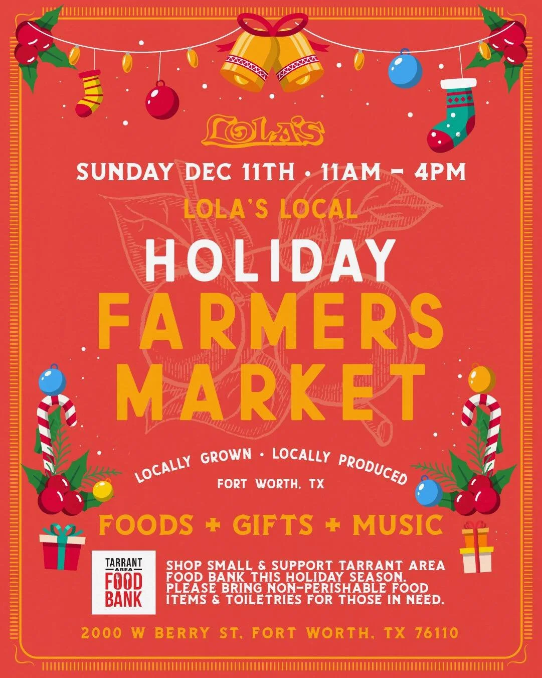 🎁 Join us Sunday December 11th for Lola's Local HOLIDAY Farmers Market + FOOD DRIVE benefiting Tarrant Area Food Bank hosted by Honeysuckle Rose!👩🌾🍅🥕🥬🌶🌱Full details below.