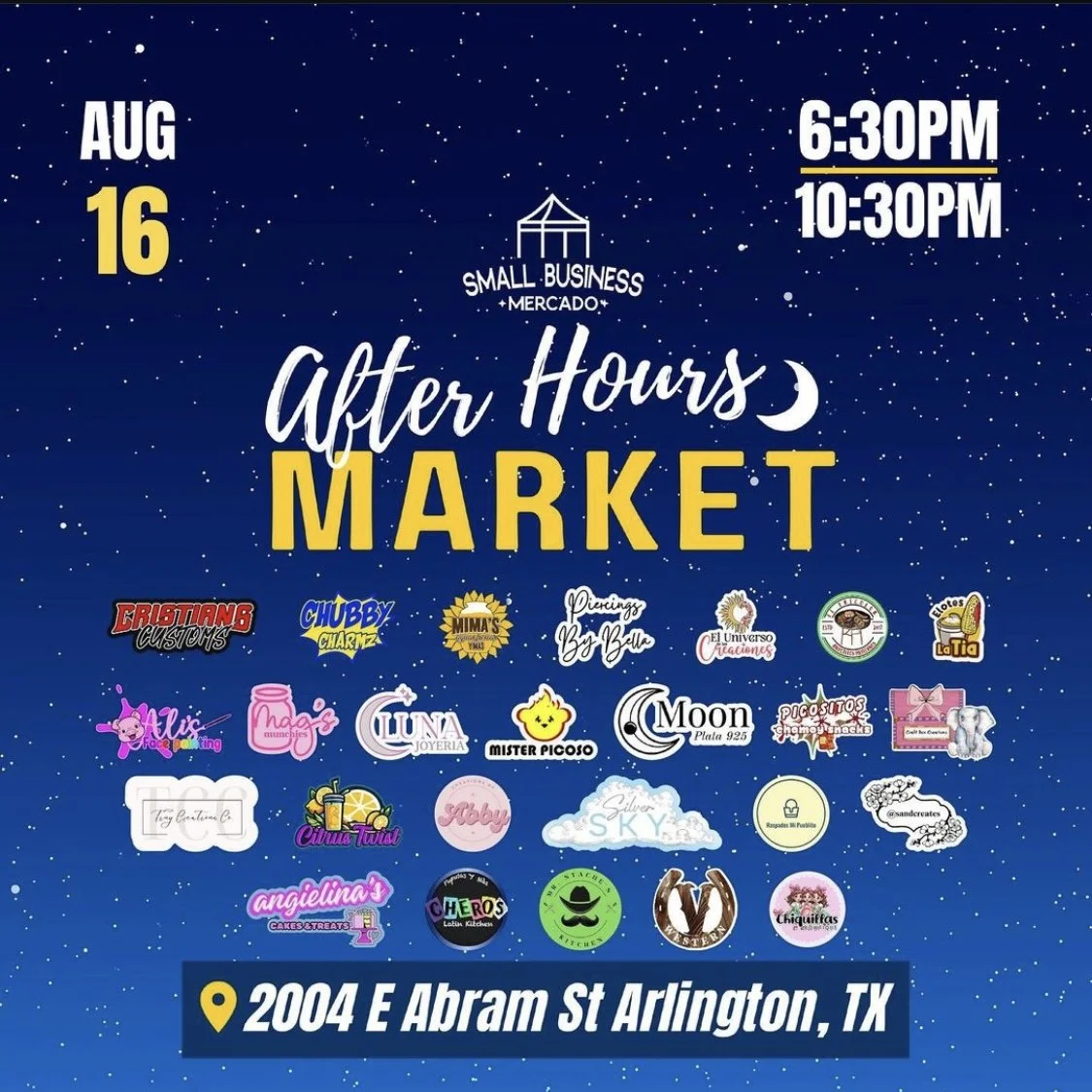 SMALL BUSINESS MERCADO IN ARLINGTON, TEXAS Friday, August 16, 2024 6:30 PM 10:30 PM Cristian's Customs 2004 East Abram Street Arlington, TX, 76010 United States (map) Google Calendar ICS